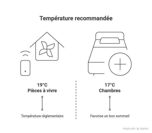 | Pièces à vivre (salon, salle à manger) | 19°C | Température réglementaire (Décret n°2007-363) pour optimiser confort et consommation. |